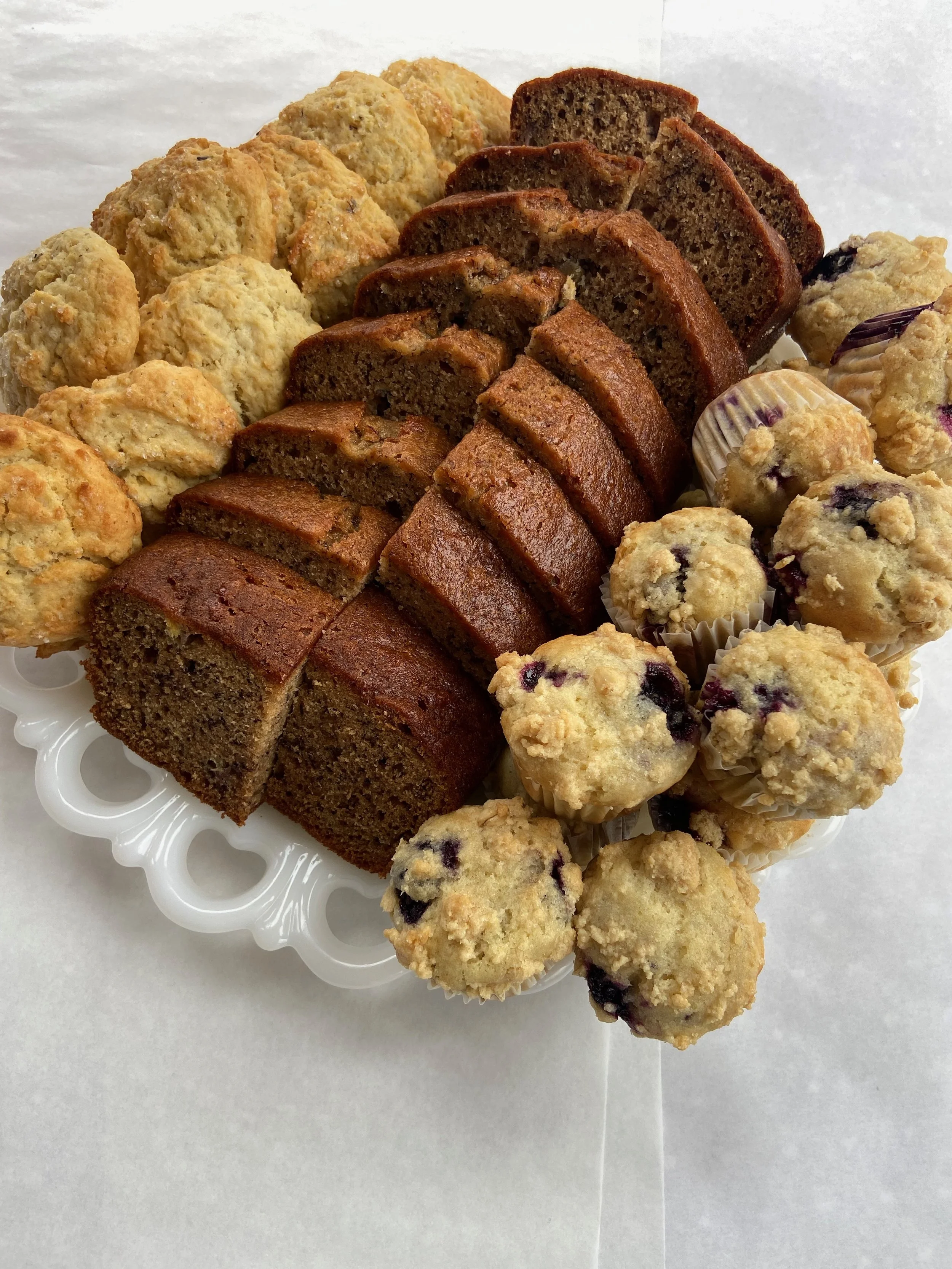 Serves 8-12: One loaf of our banana or cinnamon-swirl bread - cut into 16 pieces, 8 mini scones (seasonal flavor), 12 mini blueberry muffins - packed on a ready-to-serve tray