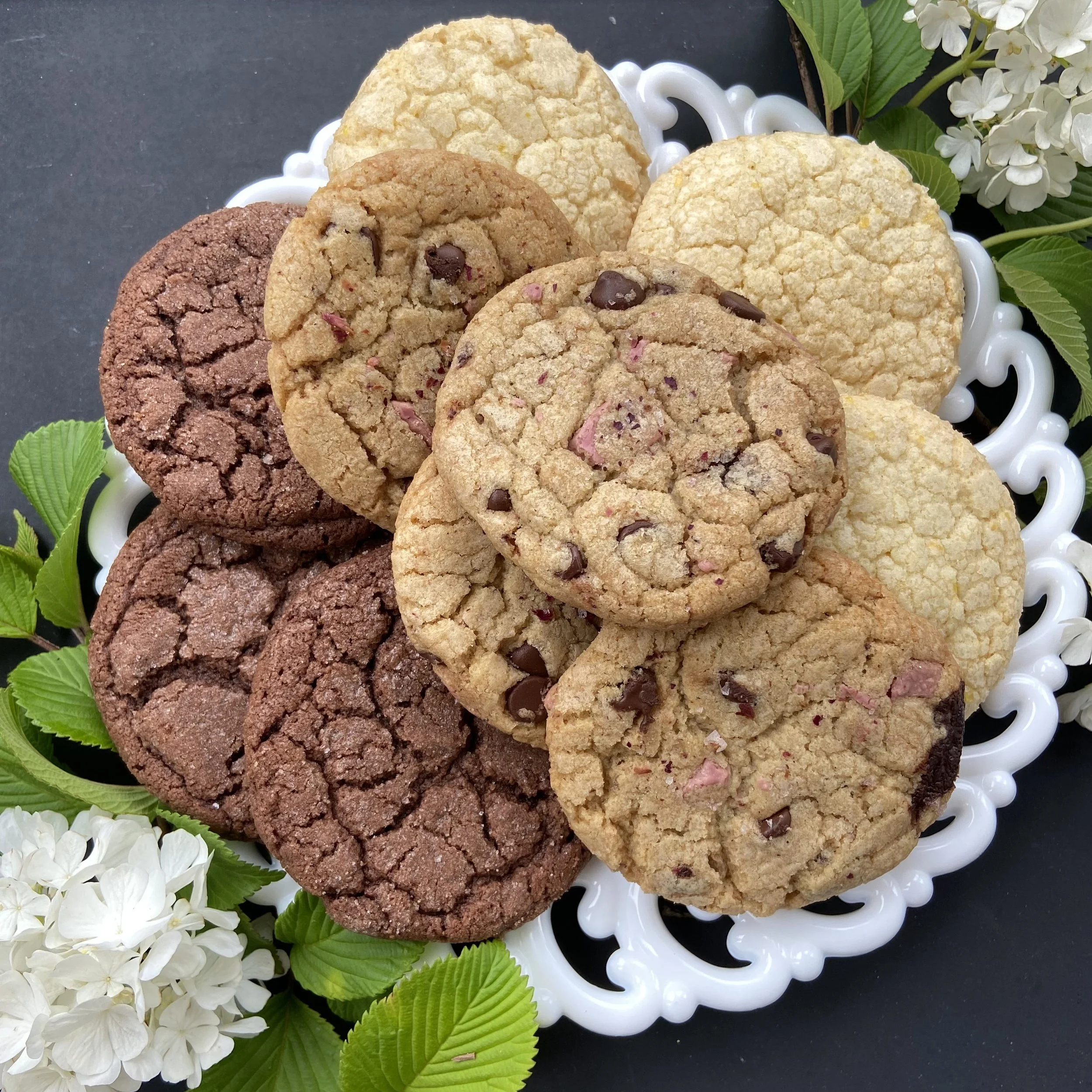 12 minimum per flavor. Chocolate chip, lemon, sugar cookies, chocolate sugar cookies, mexican hot chocolate, oatmeal + raisin, snickerdoodle, ginger, peanut butter, gf chocolate+coconut