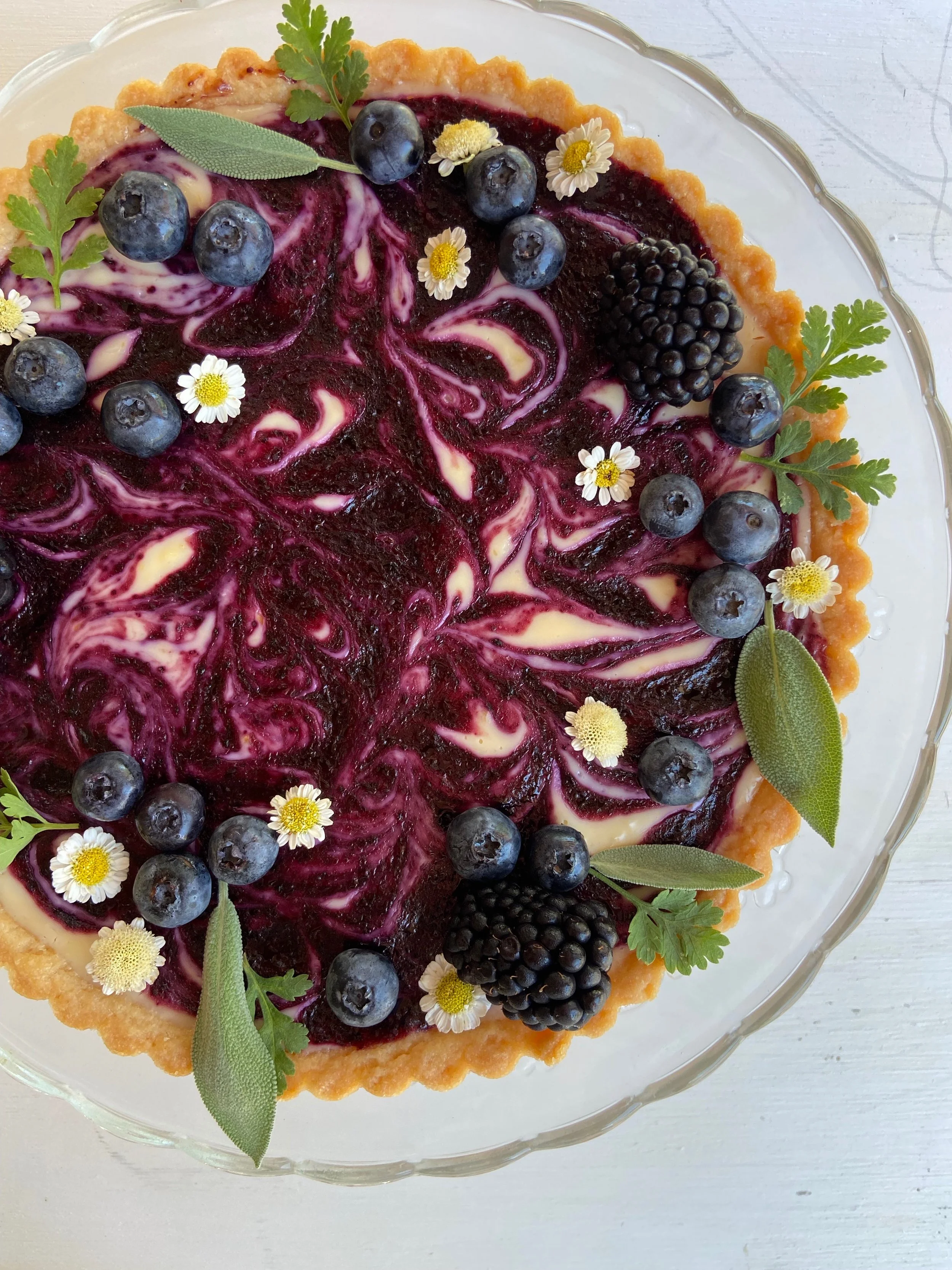 Tangy lemon filling swirled with in-season berries. Choose just the tart as-is, or, if you are serving it that day and want a little fancy, choose garnished and we'll add berries + botanicals. Serves 8-10.